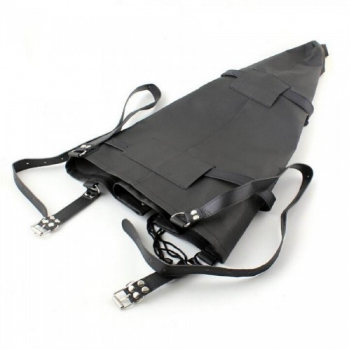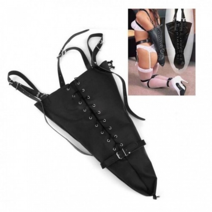 Заплеч­ный бон­даж пред­став­ляет собой большой чер­ный кону­со­об­раз­ный рукав со шну­ров­кой на двух рем­нях. Ремни пере­крещи­ваются и оде­ваются на плечи сабмиссива, а руки встав­ляются в рукав и затяги­ваются шну­ров­кой!! Пол­ное обез­движи­ва­ние, пол­ный кон­троль! Это настолько воз­бу­дит Вас и разыг­рает фан­та­зию, что Вы не захо­тите его потом снимать!